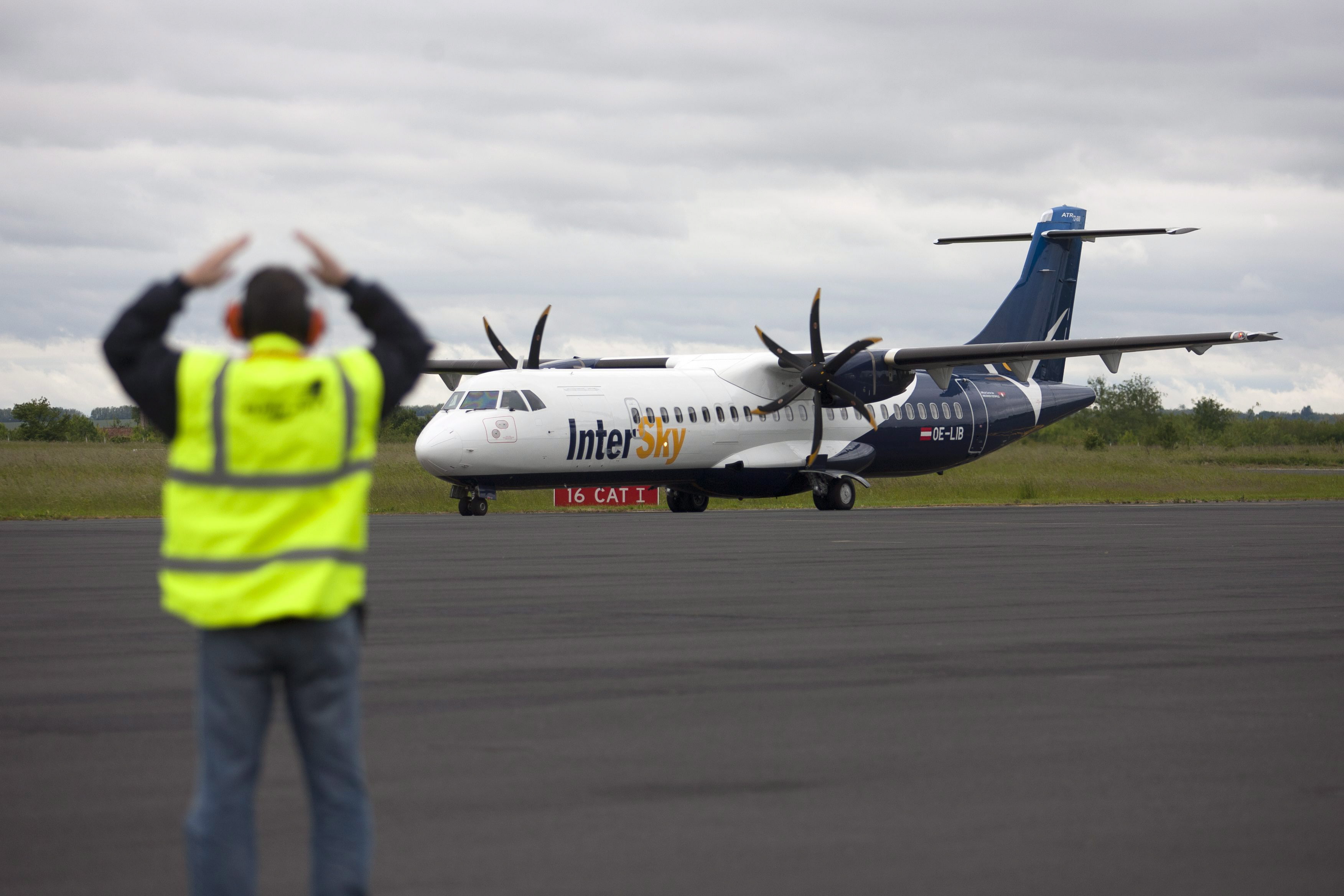 Sármellék, 2014. május 17. Az osztrák InterSky légitársaság első Bázelből érkező gépe a sármelléki Hévíz-Balaton Airport repülőtéren 2014. május 17-én. A repülőtér ősztől várhatóan kéthetente fogad chartergépeket a svájci városból. MTI Fotó: Varga György