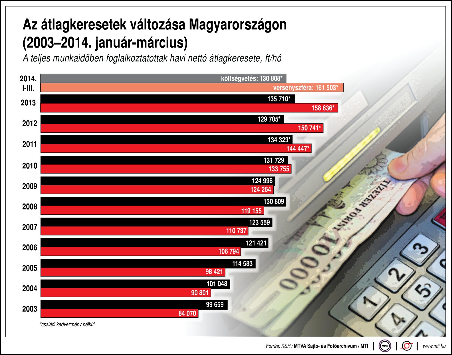 Üzlet Az átlagkeresetek változása Magyarországon (2003-2014. január-március) Az átlagkeresetek változása Magyarországon (2003-2014. január-március) teljes munkaidőben foglalkoztatottak;havi nettó átlagkereset;költségvetés és a versenyszféra;forint/hó Oszd meg Te is! Nyomtatás(Új ablakban nyílik meg) Nyomtatás Email a link to a friend(Új ablakban nyílik meg) E-mail TweetMegosztása a Tumblr-nTetszik Betöltés... Kapcsolódó bejegyzések Szerző: Investor Minden bejegyzés megjelenítése: Investor