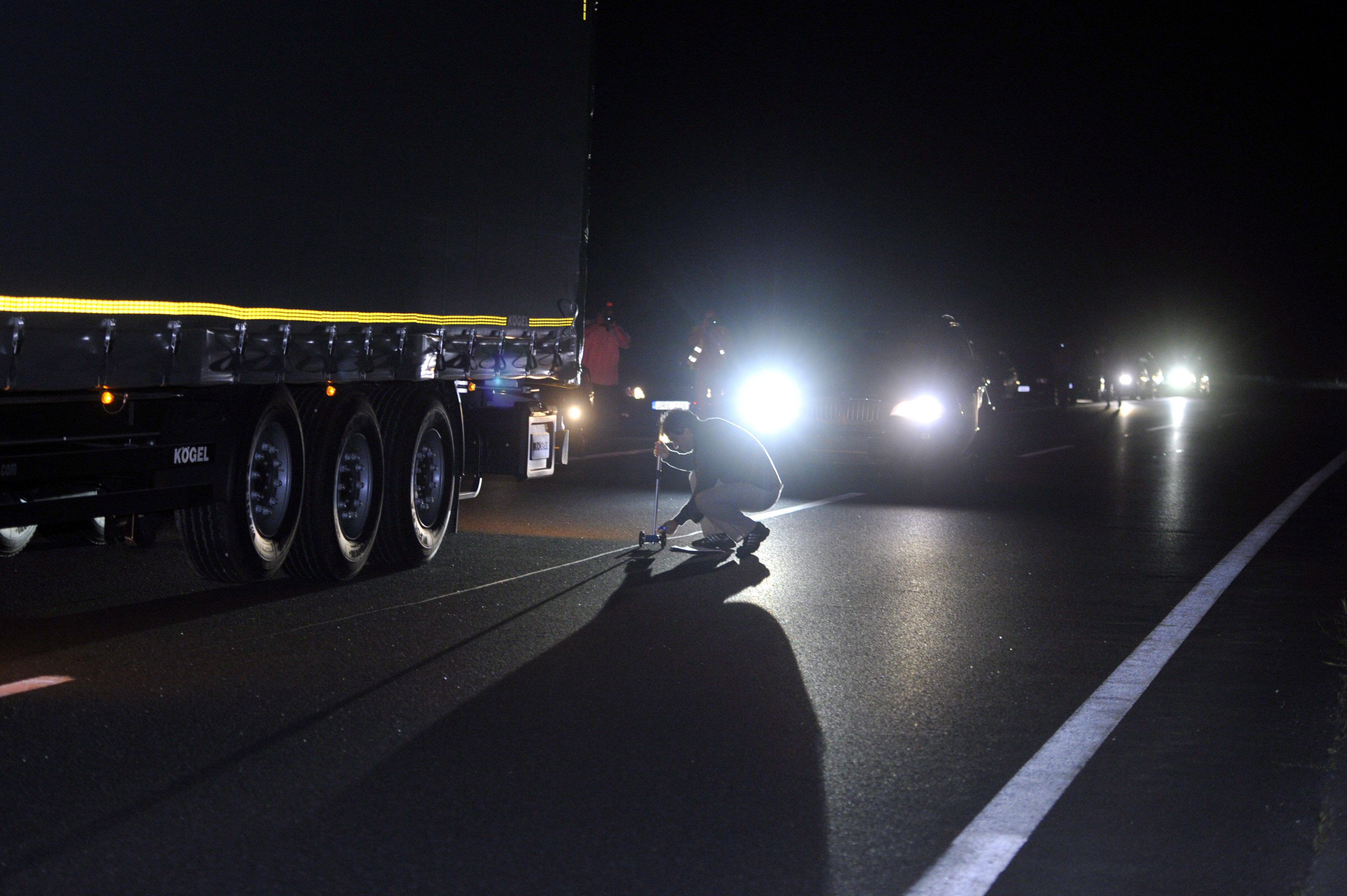 A májusi tárgyaláson kirendelt új szakértõ, Császár Gergely dolgozik a helyszíni bizonyításon az Eva Varholíková Rezesová ellen négy halálos áldozatot okozó ittas jármûvezetés vádjával folyó másodfokú büntetõperben az M3-as 39 és 55 kilométerszelvénye között 2014. június 22-ére virradó éjszaka. A vizsgálat során olyan típusú jármûveket használtak, amilyenek a balesetben is részt vettek – azaz egy BMW X5-öst és egy Fiat Puntot – továbbá egy kamiont, amelynek vezetõje szemtanúja volt az esetnek.