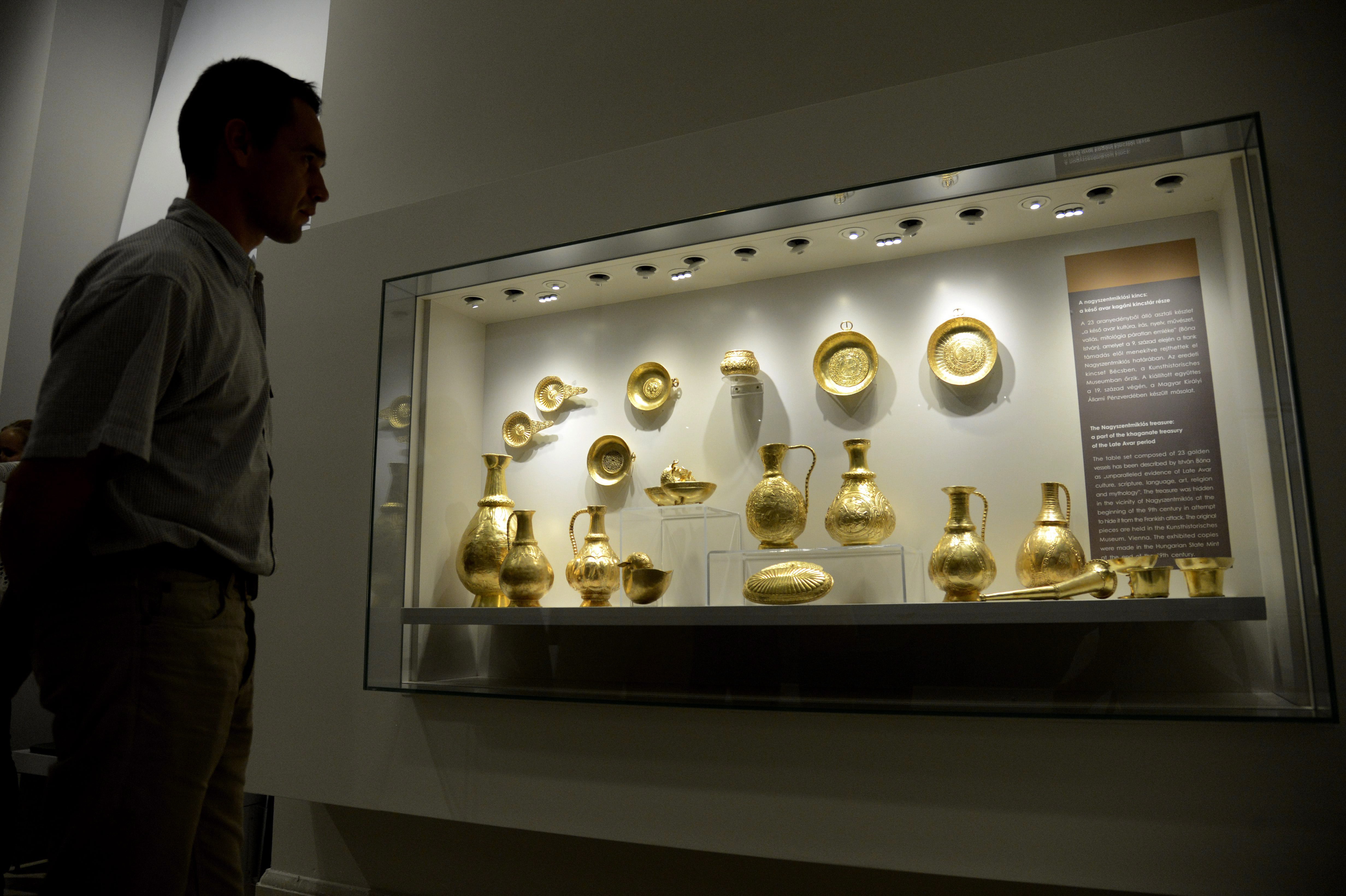 Budapest, 2014. szeptember 16. A nagyszentmiklósi kincs a Magyar Nemzeti Múzeum (MNM) megújult Karoling- és honfoglaláskori kiállításának sajtóbemutatóján 2014. szeptember 16-án. MTI Fotó: Kovács Tamás