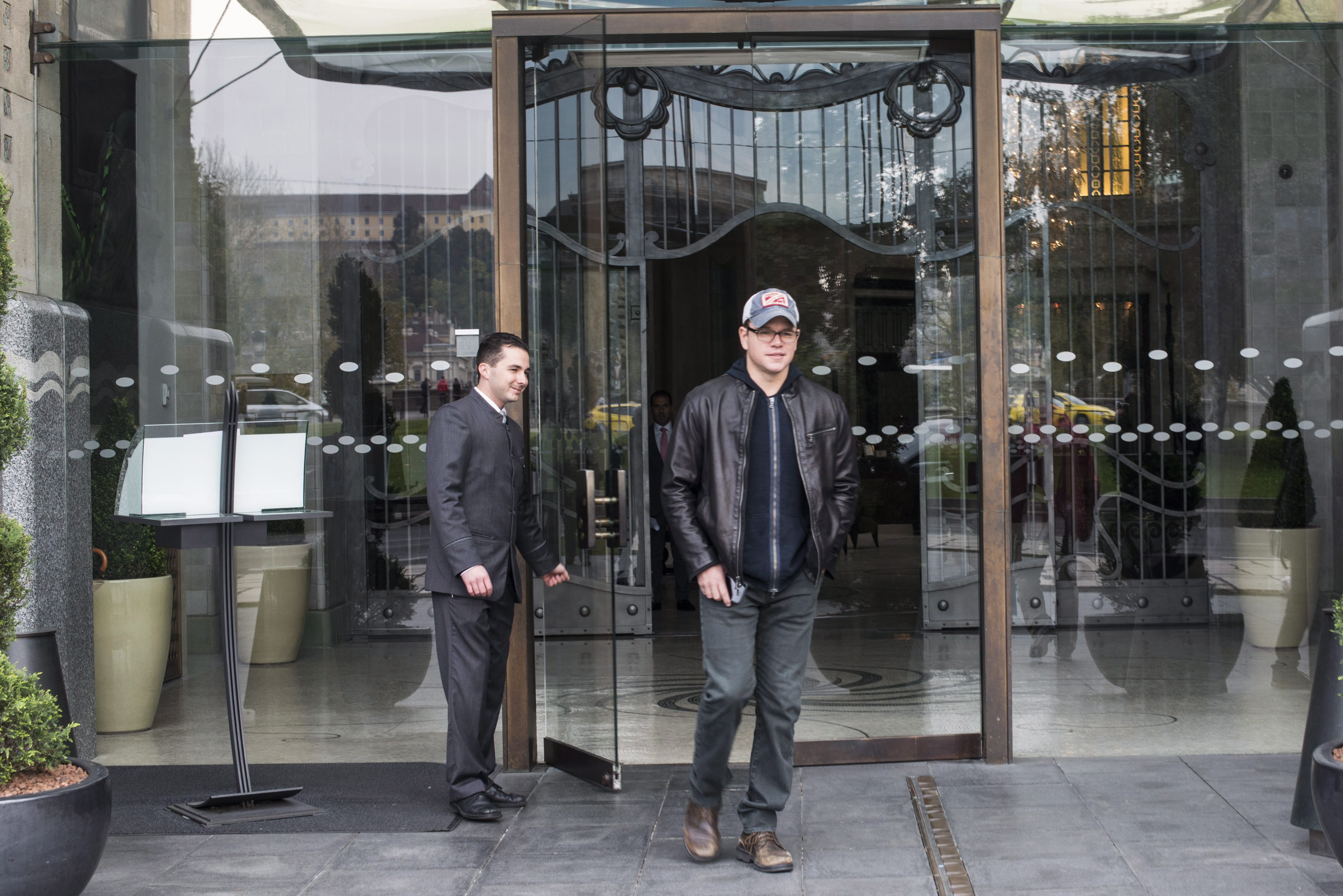 Matt Damon amerikai színész (j) a budapesti Four Seasons Hotel Gresham Palace szálloda elõtt 2014. október 29-én. Az Oscar-díjas filmsztár Ridley Scott angol filmrendezõ és producer The Martian címû sci-fi filmjének forgatására érkezett Magyarországra.