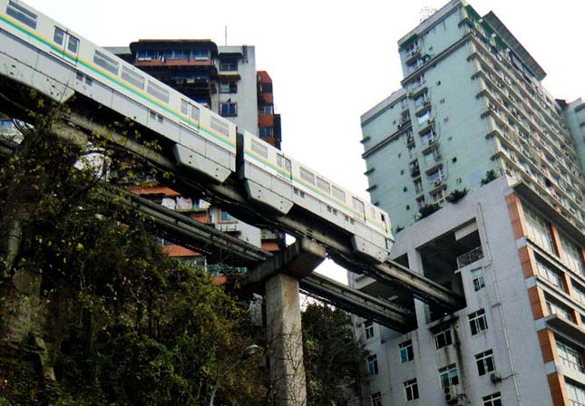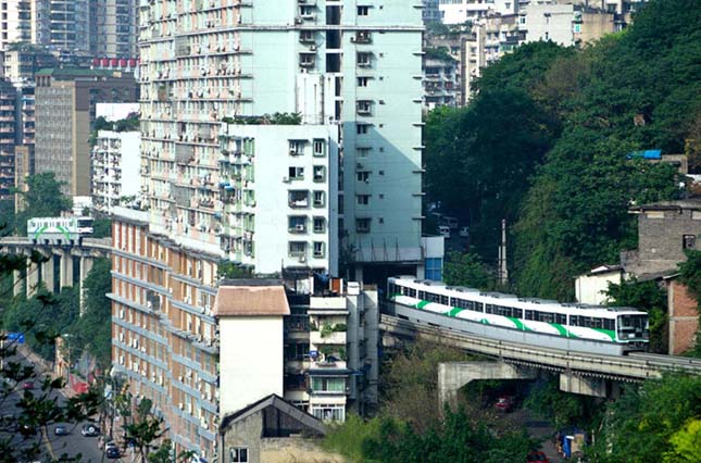 A kínai chongqingi vasútvonalnak van egy igen különleges szakasza, ahol a szerelvények egy komplett lakótömbön haladnak keresztül. Ezen a vasútvonalon 2004 óta szállítják az utasokat az épületeken keresztül, ahol a lakóknak a fellépő rezgéssel és a szerelvények hangjával is együtt kell élniük.