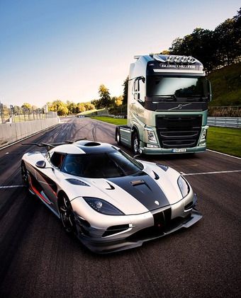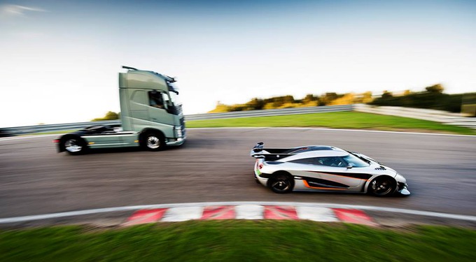 Nagyon nagy Volvo-rajongónak kell ahhoz lenni, hogy elhiggyük, a kamion lenyomja a versenyautót. Azt a szuperjárgányt, amit nemrégiben azért nem tudtak elsőre regisztrálni Németországban, mert a németek rendszere ilyen teljesítményű autóra „nincs” ráállva, a német rendszer három számjegyig enged regisztrálni, a Koenigsegg Agera One:1 viszont négy számjegyű, azaz 1000 KW-os. Persze másodjára megoldották.