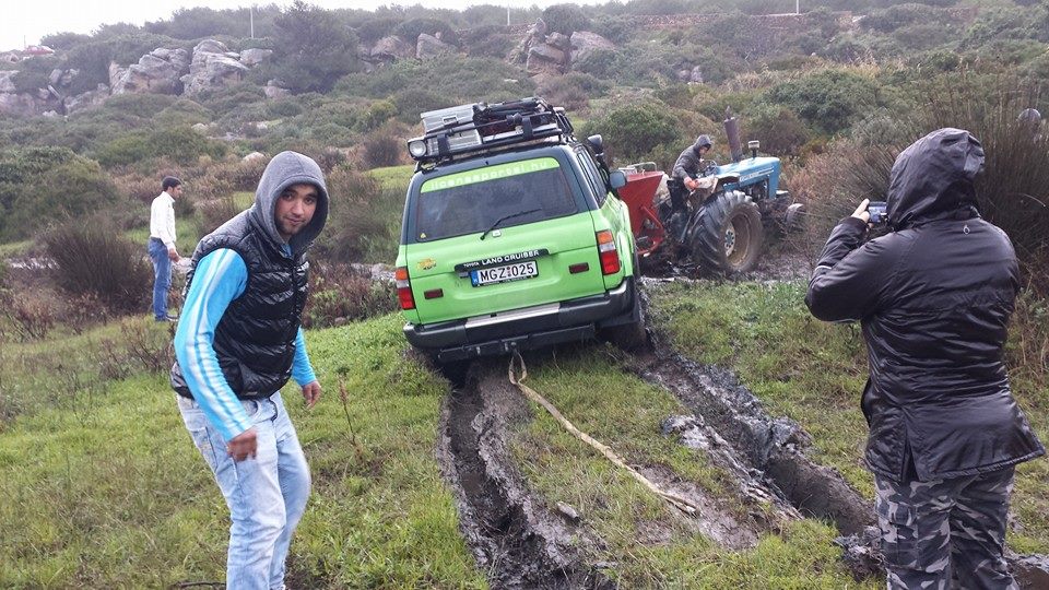 A 12-es team (Powered by Windows 8, verseny kategória, HDJ80) is megérkezett már Marrakeshbe. A csapat egy elakadás közben készített fotót. Látszik, hogy a vastagon saras, átázott talajon nem könnyű átevickélni, minimum egy traktor kell hozzá. De mindez semmi, hiszen az autópályán a legnagyobb sötétség kellős közepén a közepébe csöppentek egy autós üldözésnek, ahol a sávjukban szembe jövő gépkocsit rendőrök üldözték…