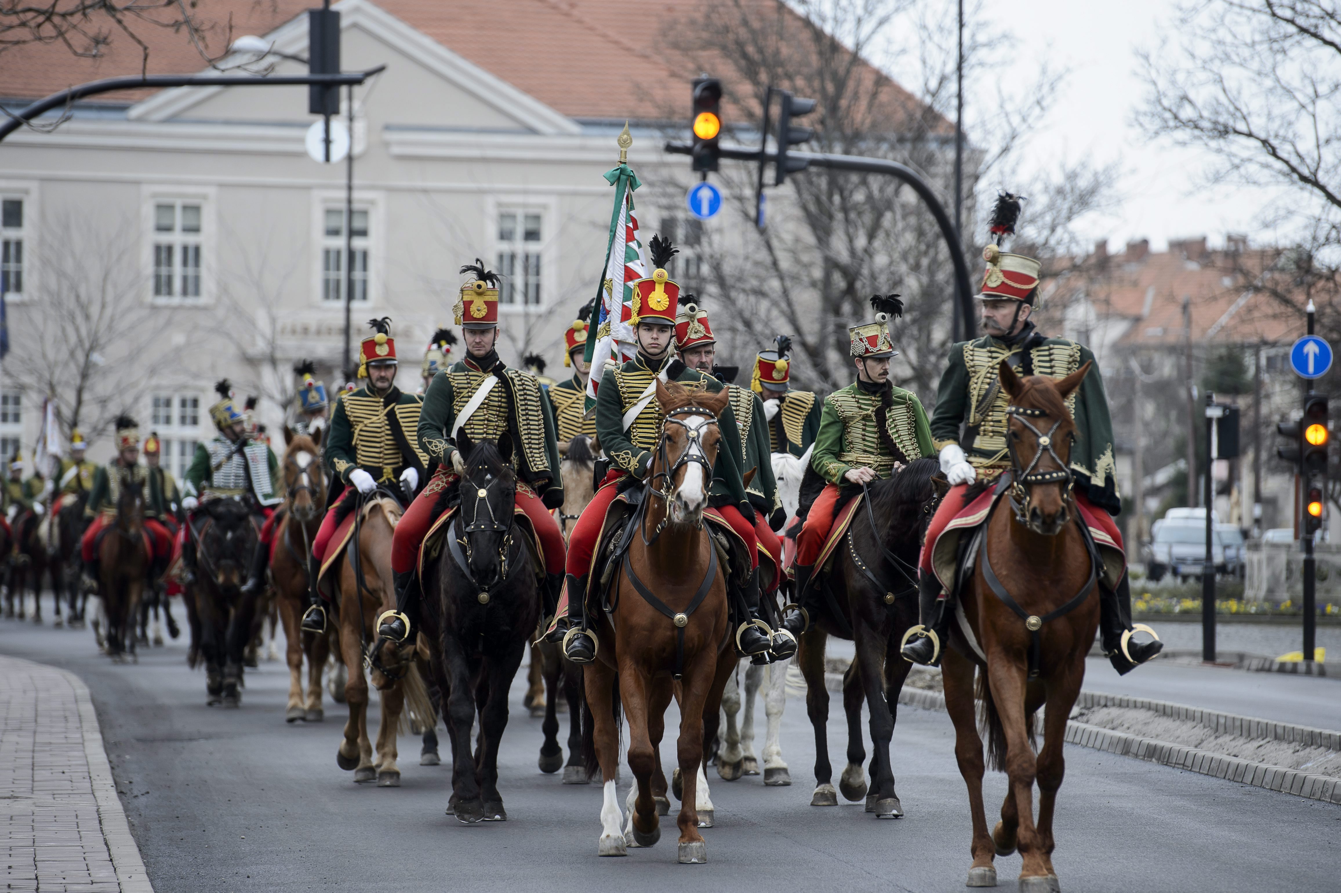 Hatvan, 2015. március 28. Hagyományõrzõ lovas huszárok vonulnak fel a hatvani csata 166. évfordulója alkalmából rendezett ünnepségen Hatvan belvárosában 2015. március 28-án. MTI Fotó: Komka Péter