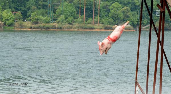 Zou Wei, a Tuhe Fekete Sertés nevű vállalkozás menedzsere azt mondja, a disznók túl lusták, ezért muszáj őket megmozgatni ahhoz, hogy egészségesebb, alacsonyabb zsírtartalmú legyen a húsuk. A céget kifejezetten a malacmozgatásra hozták létre, búvárkodási és úszási lehetőséget biztosítanak a “klienseiknek”.
