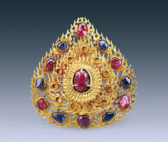Egy szintén drágakövekkel kirakott, aranyláncon függő, lótusz szirmokkal díszített piperedobozkán hét szanszkrit írásjel is jól kivehető.