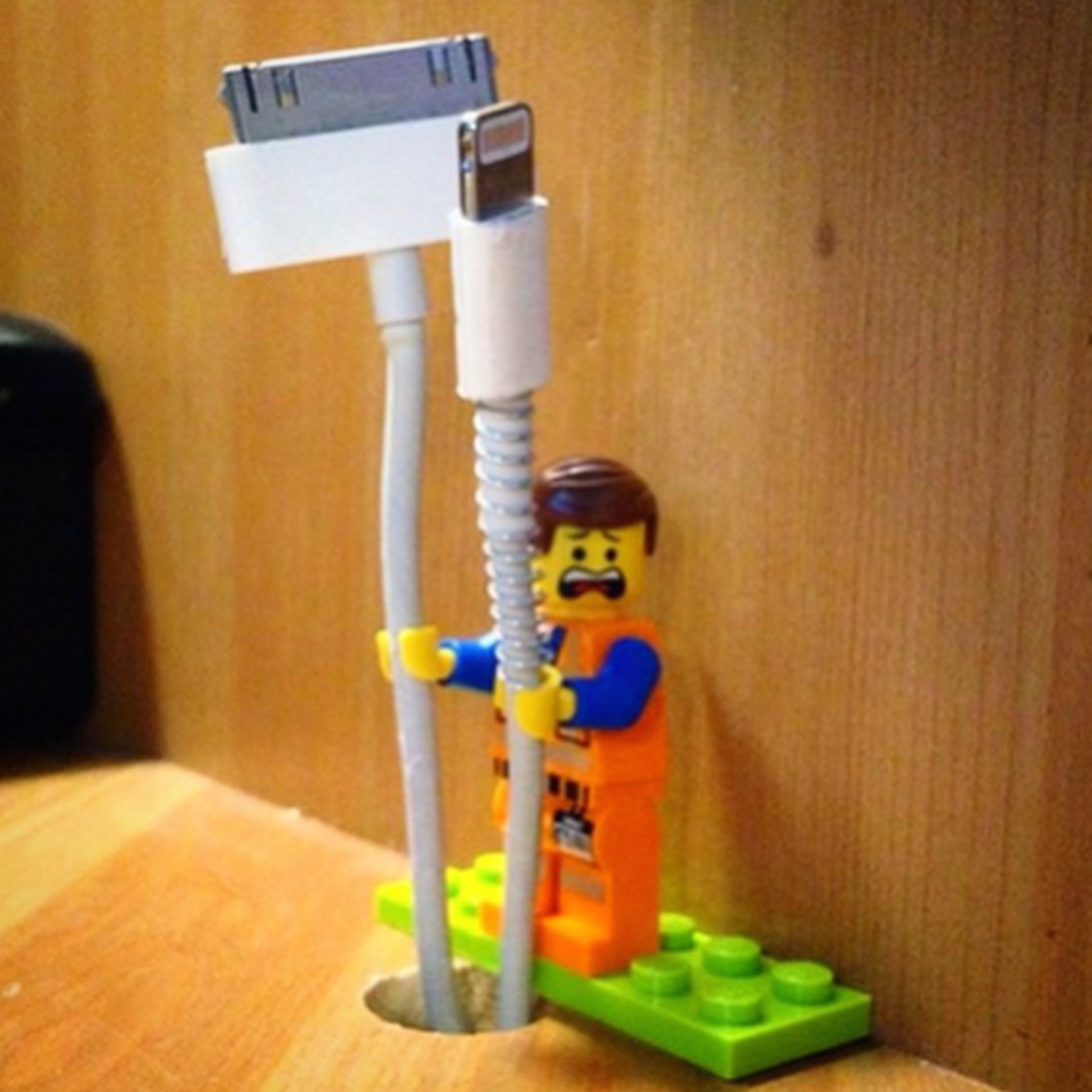 1. Nyilván téged is idegesített már sokszor, hogy összevissza gabalyodnak a telefontöltők. Különösen, amikor éppen töltenéd a mobilodat. A megoldás egyszerű! Menj be a gyerek szobájába, keress ki a LEGO dobozából egy figurát, állítsd rá egy masszívabb talpra, és add a kezébe a telefonzsinór két végét. ENNYI!