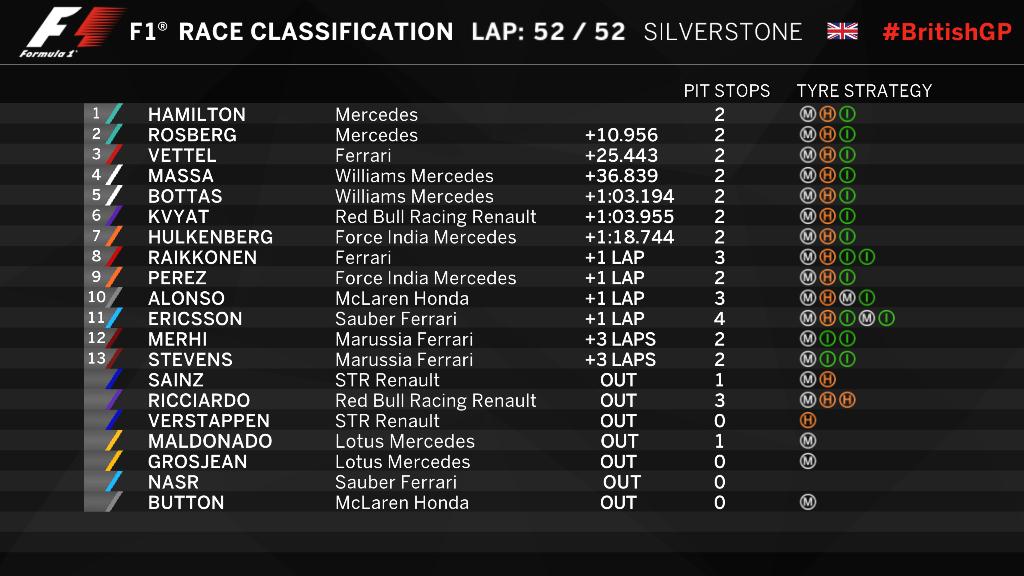 Silverstone-ban, hazai pályán Lewis Hamilton ismét győzedelmeskedett, a második helyre Nico Rosberg csapott le, így a Mercedes csapat újra kettős győzelmet tudhat a magáénak. De a verseny azért nem volt ennyire egyértelmű.