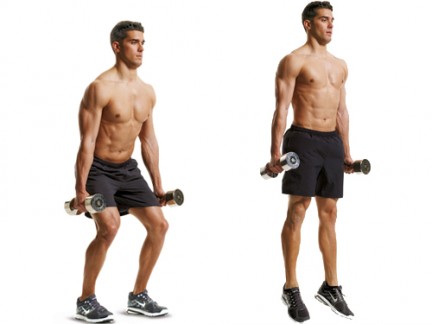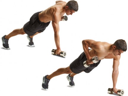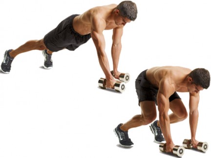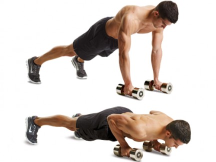 Menj le fekvőtámaszba, fogd meg a pár súlyzót. Engedd le a mellkasodat, és 2 másodpercig maradj így, majd nyomd magad vissza.Emeld fel a súlyzót a jobb kezeddel, a mellkasod oldalához, majd engedd le a padlóra. Most jöjjön ugyanez a bal kezeddel.Kezdj el “sétálni” a kezeidben tartott súlyzóval a lábad irányába. A lábaddal pedig lépj előre. Tegyél meg mindkét súlyzóval 3-3 lépést addig, amíg a hátad megfeszül.Állj fel úgy, hogy a súlyzókat két oldalt lelógatod. Ugorj fel robbanásszerűen 5-10 alkalommal. Ezt ismételd meg 2-3-szor.