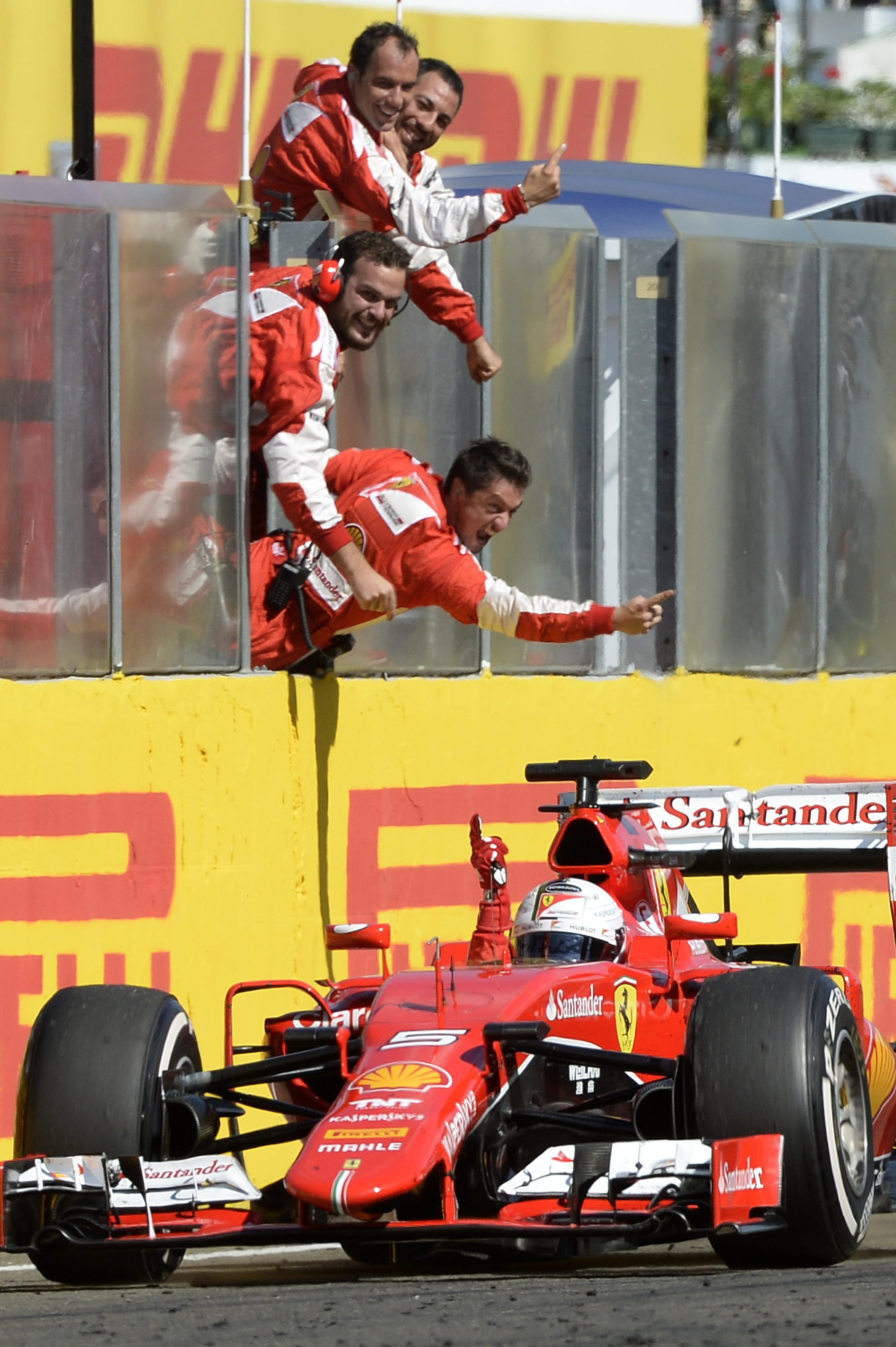 Sebastian Vettel, a Ferrari német versenyzõje ünnepel a célban, miután megnyerte a Forma-1-es autós gyorsasági világbajnokság 30. Magyar Nagydíját a mogyoródi Hungaroringen 2015. július 26-án.