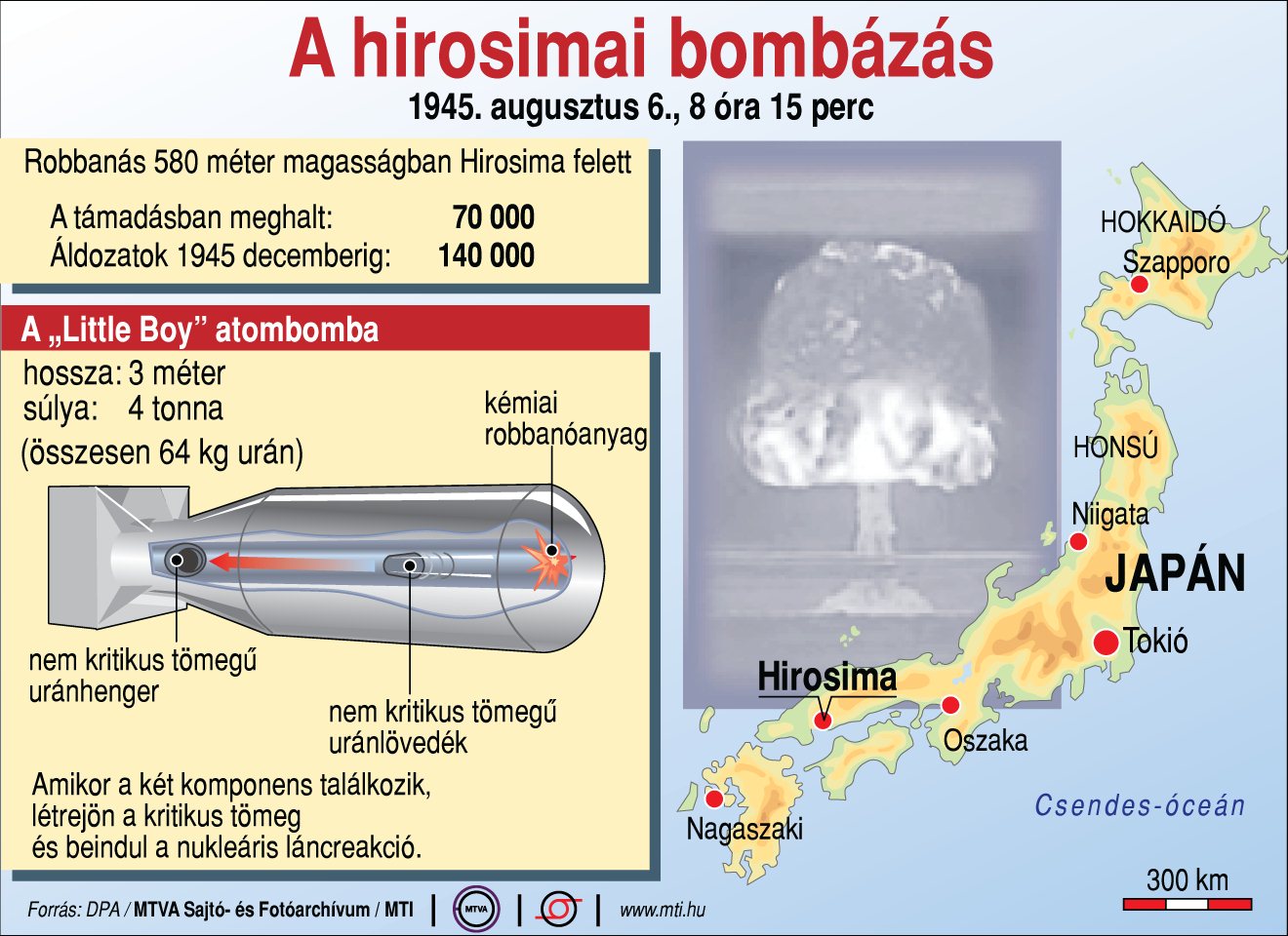 1945. augusztus 6., 8 óra 15 perc; Robbanás 580 méter magasságban Hirosima felett; A támadásban meghalt: 70000; Áldozatok 1945 decemberig: 140000; A Little Boy atombomba hossza: 3 méter, súlya: 4 tonna, összesen 64 kg urán, kémiai robbanóanyag, nem kritikus tömegű uránhenger, nem kritikus tömegű uránlövedék; Amikor a két komponens találkozik, létrejön a kritikus tömeg és beindul a nukleáris láncreakció.