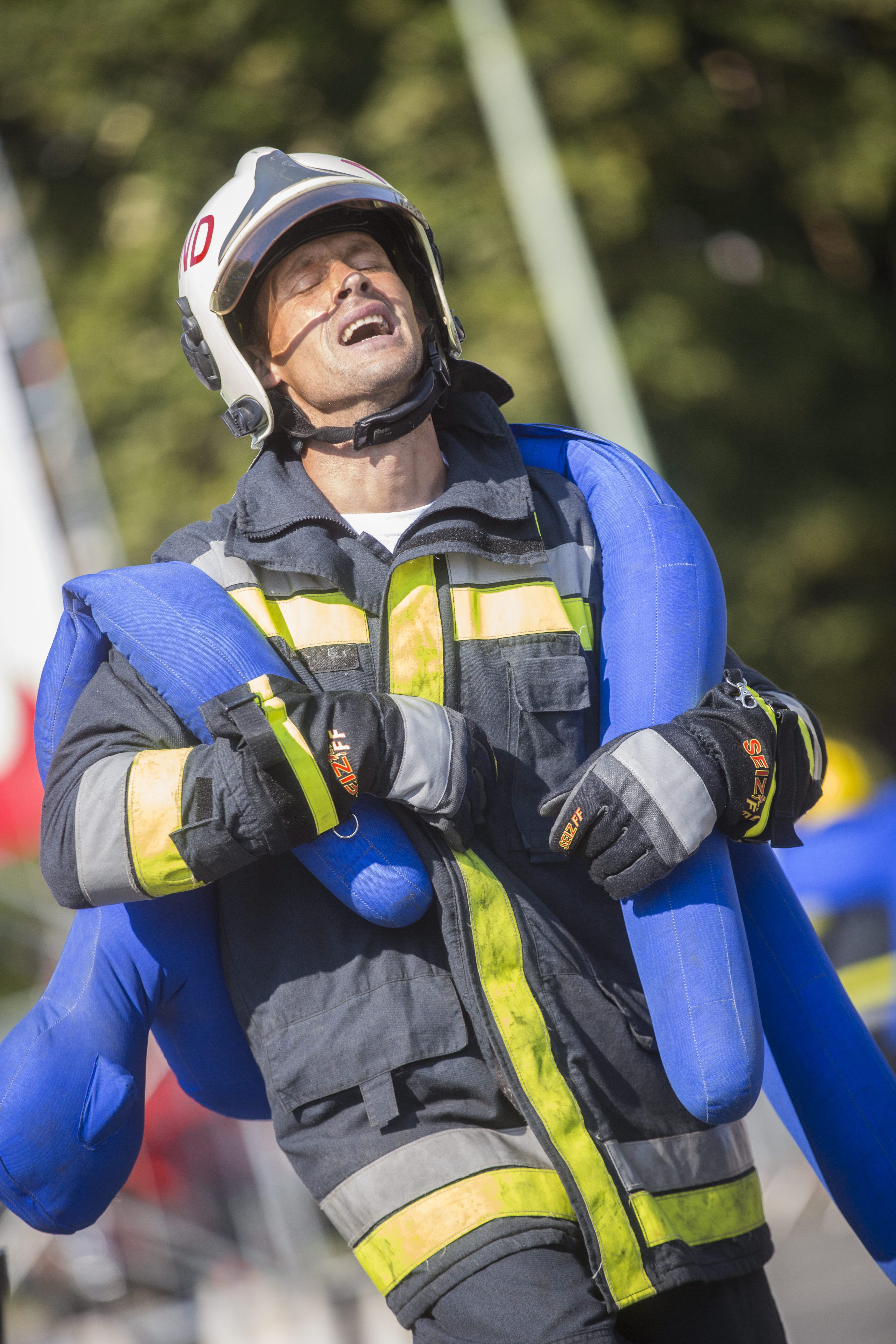 Nyolcvan kilogrammos bábut visz hátán egy versenyzõ a legerõsebb tûzoltók versenyén Orosházán 2015. augusztus 29-én. Második alkalommal rendezhette meg Orosháza a TFA (Toughest Firefighter Alive) elnevezésû megmérettetést, amelyen mintegy 120 magyar, román, szlovák és szerb tûzoltó versenyzett.