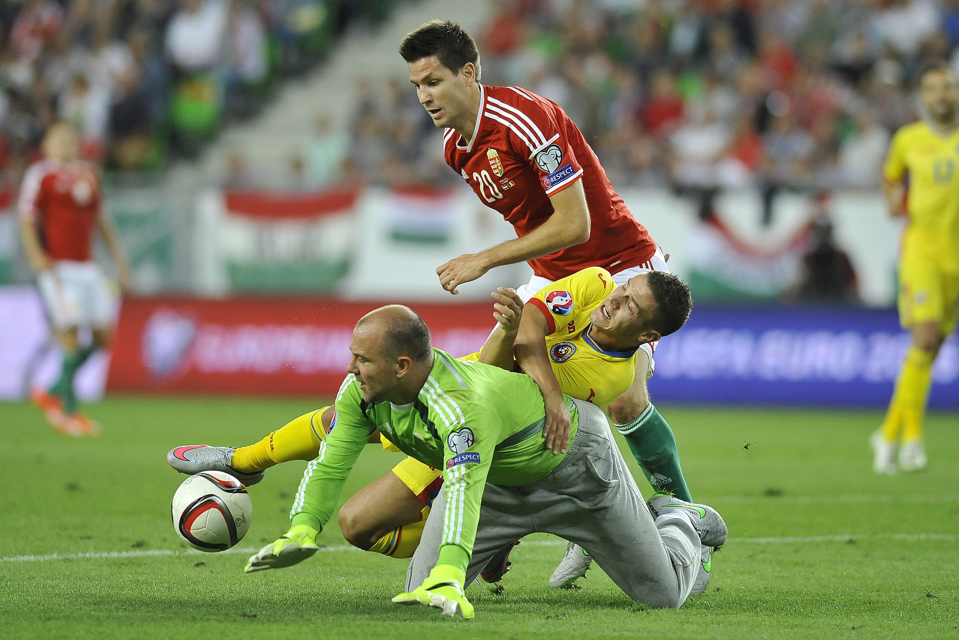 Király Gábor kapus (elöl) és Guzmics Richárd (hátul), valamint a román Gabriel Torja a Magyarország-Románia labdarúgó Európa-bajnoki selejtező mérkőzésen Budapesten, a Groupama Arénában 2015. szeptember 4-én.