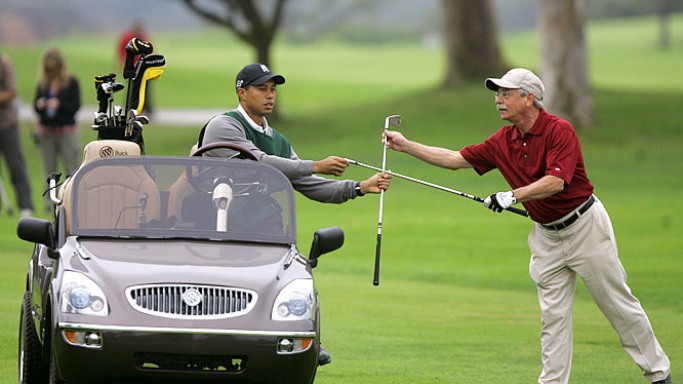 A Buick pedig egyenesen annyira bejön, hogy nemcsak hagyományos autóban, de még golf-autóban is azzal hasít Tiger 🙂