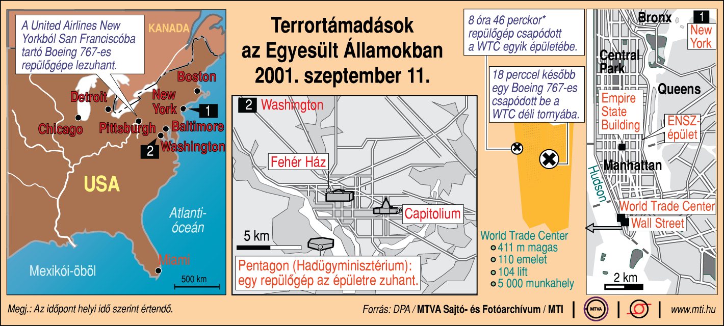 8 óra 46 perckor repülőgép csapódott a WTC egyik épületébe. 18 perccel később egy Boeing 767-es csapódott be WTC déli tornyába.;
