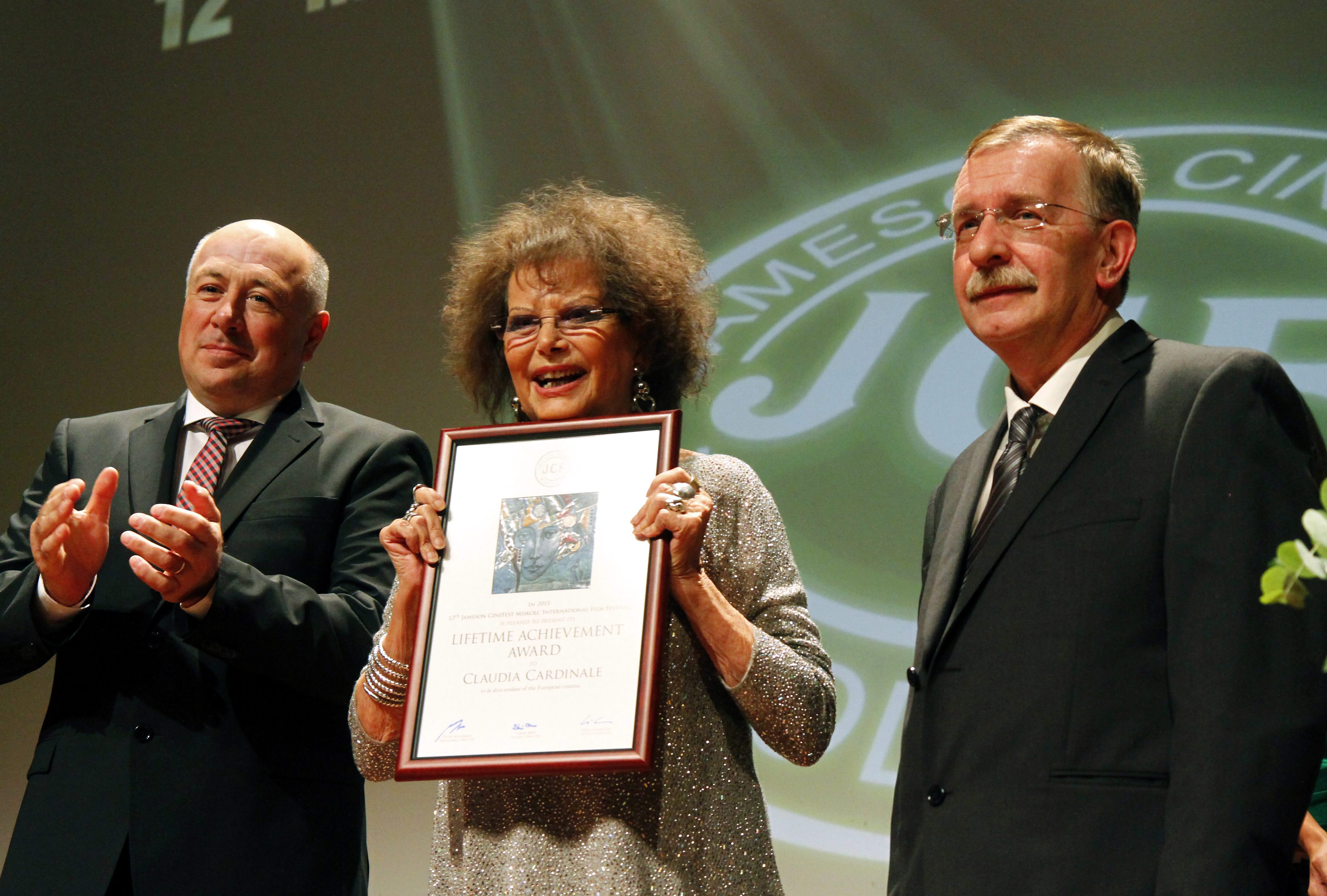 Claudia Cardinale színésznõ, a 12. Jameson CineFest Miskolci Nemzetközi Filmfesztivál életmûdíjasa, Kriza Ákos polgármester (b) és Bíró Tibor fesztiváligazgató a fesztivál megnyitóünnepségén 2015. szeptember 11-én.