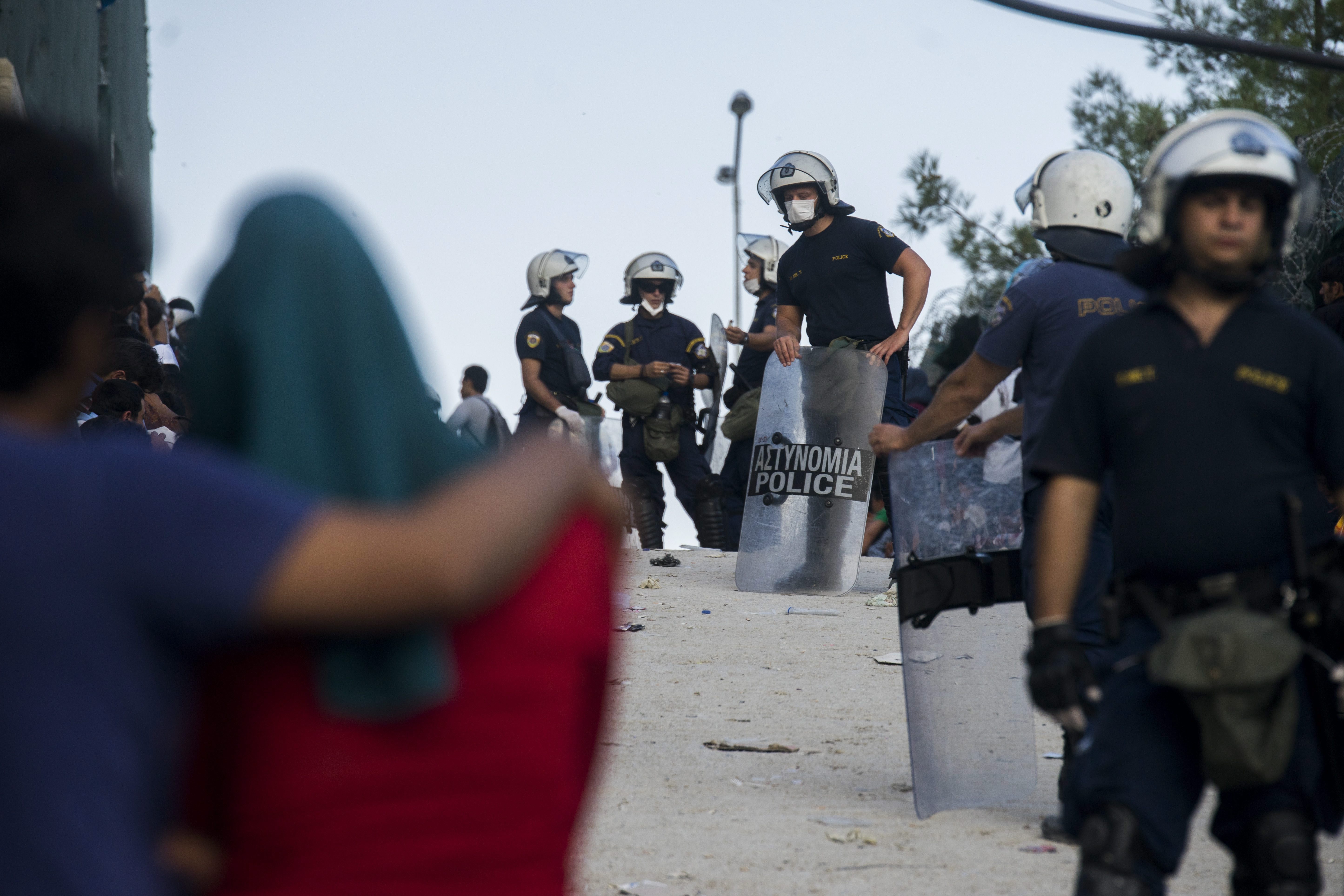 Migránsok várakoznak hogy regisztrálják õket egy afgánoknak elkülönített táborban a görög Leszbosz szigetén Moria közelében 2015. október 6-án.