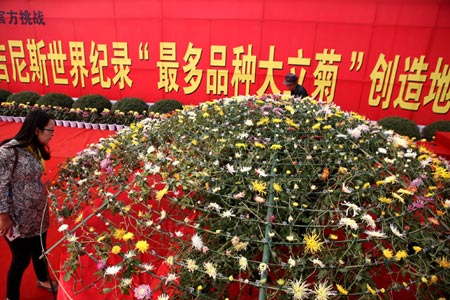 Peking, 2015. október 19., hétfő (MTI) – A közép-kínai Kajfeng városában 641 különböző krizantémból állították össze a világ legnagyobb, s immár a Guinness Világrekordok által is ekként hitelesített sokvirágú élő krizantémcsokor kompozícióját – számolt be a kínai média hétfőn.