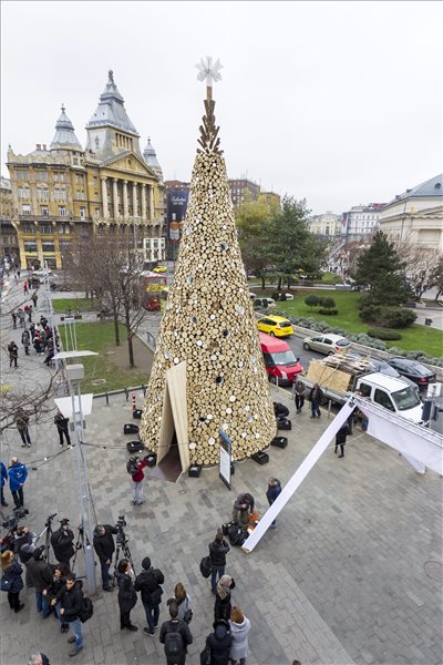 A Hello Wood építész- és dizájnstúdió 16 méter magas, 30 négyzetméter alapterületű, 40 tonna tűzifából épített óriási karácsonyfája az Erzsébet téren 2015. december 8-án. A Design Terminál és az Ökumenikus Segélyszervezet közös akciója keretében az ünnepek után az alkotás elemeit rászorulóknak osztják szét tűzifaként(MTI).