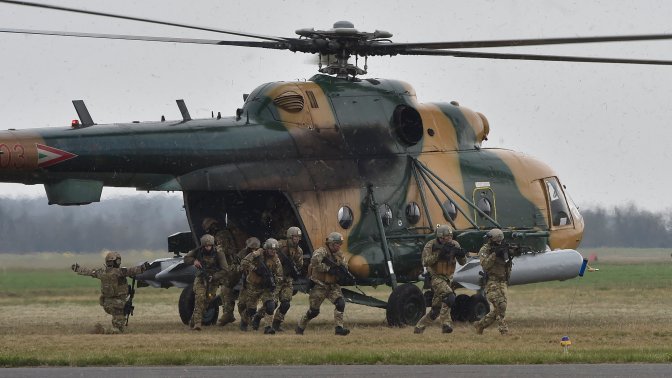 Légi deszantosok a Visegrad 4Sight 2018 V4-es katonai gyakorlaton a szolnoki Ittebei Kiss József helikopterbázison 2018. március 29-én.