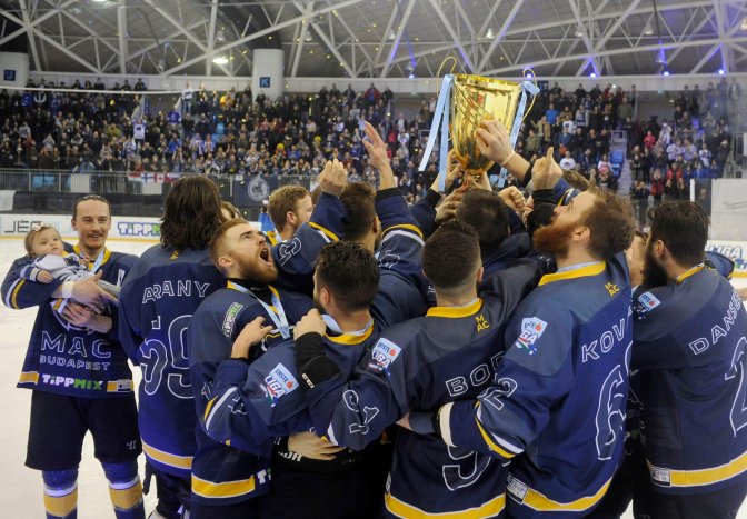 A bajnok MAC Budapest játékosai ünnepelnek a trófeával a budapesti Tüskecsarnokban 2018. március 31-én, miután a jégkorong Erste Liga döntõjének ötödik mérkõzésén hosszabbítás után 3-2-re legyõzték a címvédõ DVTK Jegesmedvék csapatát és ezzel 4-1-re megnyerték a párharcot. A MAC története elsõ diadalát aratta.