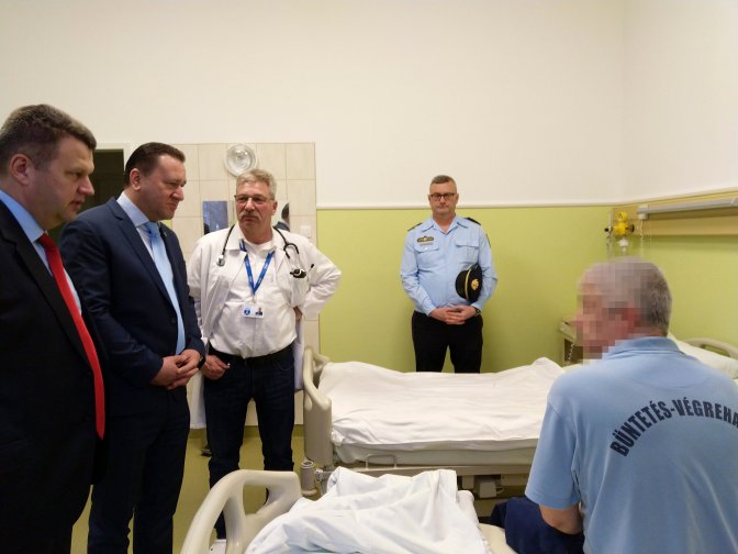 A Büntetés-végrehajtás Országos Parancsnoksága (BvOP) által közreadott képen Tóth Tamás bv. vezérõrnagy, a büntetés-végrehajtás (bv.) országos parancsnoka (b2) valamint biztonsági és fogvatartási helyettese, Schmehl János bv. vezérõrnagy (b) meglátogatja az ezen a napon a Fõvárosi Törvényszékrõl megszökött rabot elõállító felügyelõt (j) a Bajcsy-Zsilinszky Kórházban 2019. február 15-én. A felügyelõ nem hibázott, akinek egy elítélt elvette fegyverét -közölte a BvOP. A rabot a XV. kerületi Szentmihályi út és Nyírpalota út keresztezõdésénél sikerült feltartóztatni.