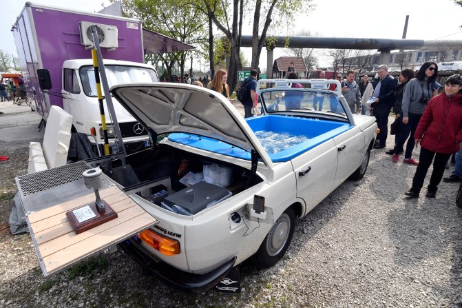 Fürdõmedencévé és grillsütõvé átalakított Wartburg a budapesti Vasúttörténeti Parkban rendezett veteránautó-kiállításon 2019. április 7-én.
