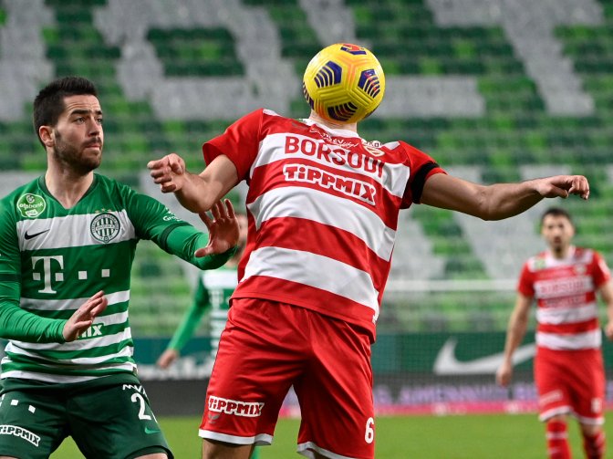 A ferencvárosi Botka Endre (b) és a diósgyõri Vinko Soldo a labdarúgó OTP Bank Liga 2. fordulójából elhalasztott Ferencvárosi TC – Diósgyõri VTK mérkõzésen a Groupama Arénában 2021. január 20-án.